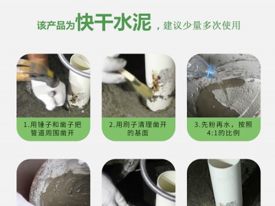 將滲漏點(diǎn)鑿成“V”或“U”型口,待料團(tuán)初凝稍硬時(shí)塞入漏水點(diǎn),表層壓實(shí)抹光;對(duì)嚴(yán)重滲漏處(可拌干粉壓實(shí)或插管引